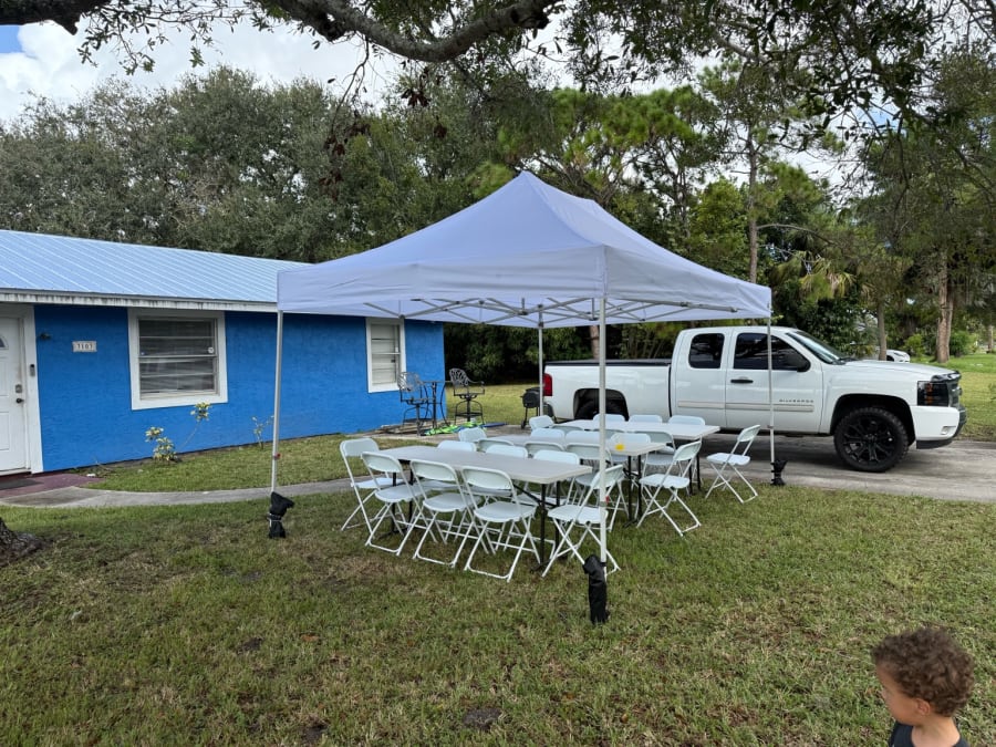 When your guest list goes beyond the basics, the Bigger White Party Package from Sunrise City Rentals gives you the extra space and seating you need. This bundle includes a 10×15 white canopy tent, three banquet tables, and 24 white folding chairs, creating a clean, shaded setup for larger gatherings. It’s an excellent choice for weddings, milestone birthdays, graduations, school events, church functions, and community festivals.