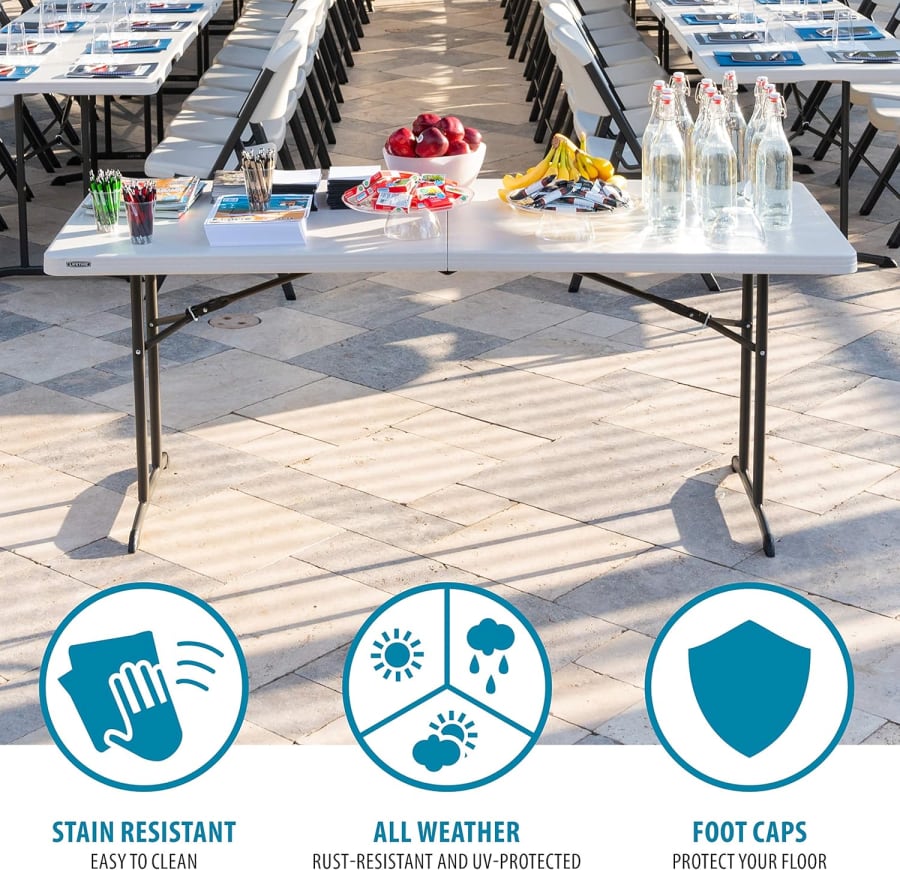 Our 6′ rectangular banquet tables are the perfect foundation for any party. Whether you’re serving food, setting up drinks, or arranging activities, these versatile tables give your guests plenty of space to enjoy the event. Durable and practical, they pair perfectly with our canopy tents and white folding chairs.