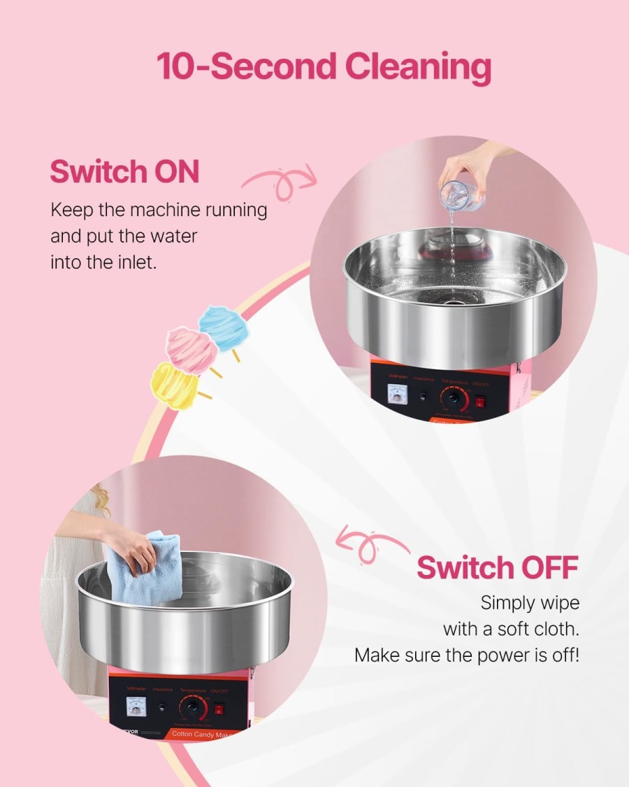 Our cotton candy machines are user-friendly. Simply add flavored sugar, spin, and collect the cotton candy on a cone.