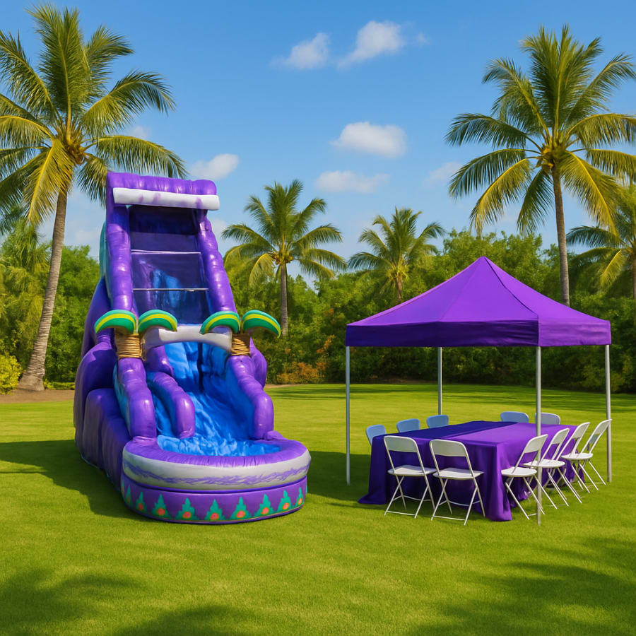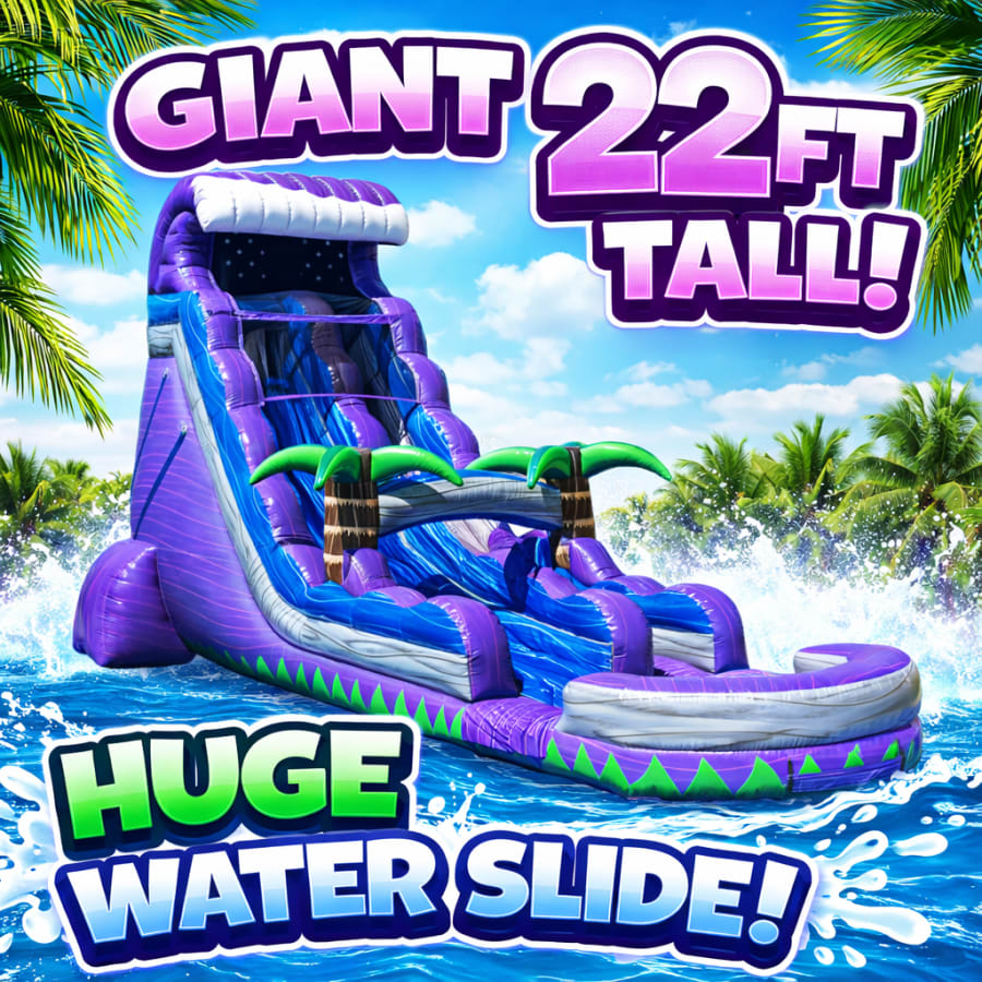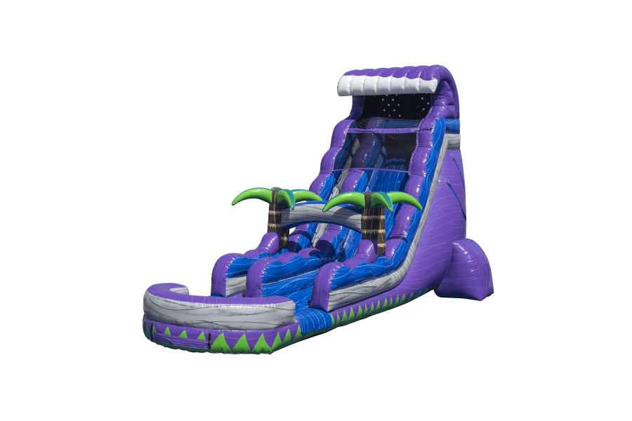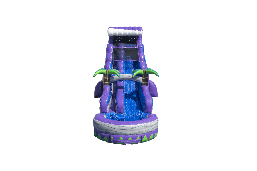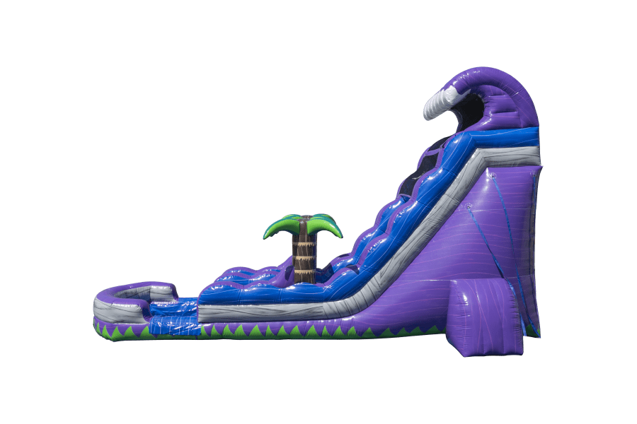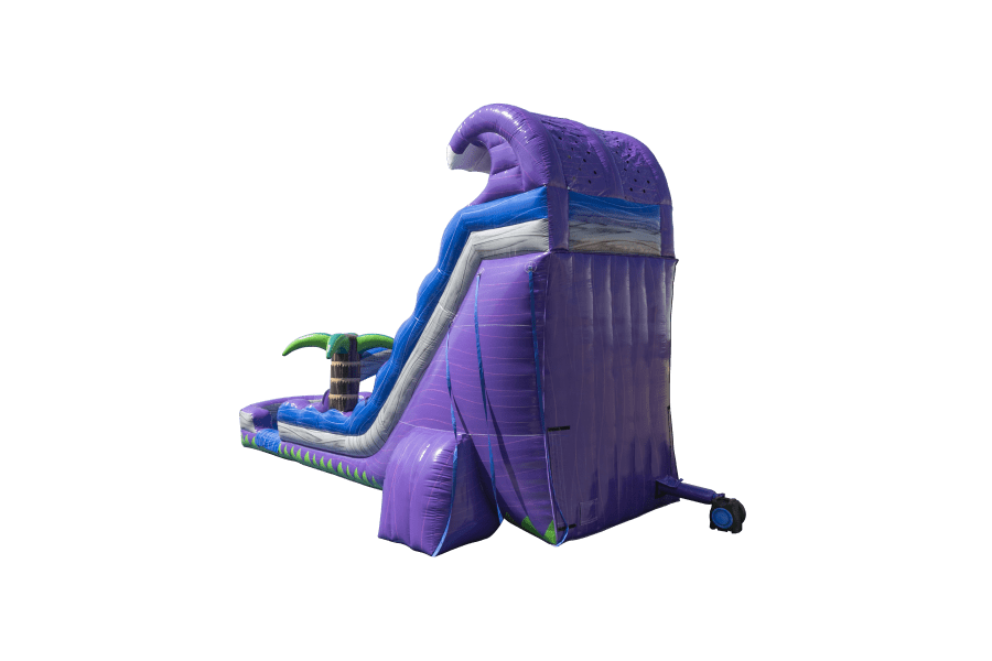 Make a serious splash with the Purple Crush Tsunami, a towering 22-foot inflatable water slide built for high-energy fun and unforgettable reactions. Its bold purple tropical design instantly commands attention, while the steep ride and long splash landing deliver a thrilling experience riders will line up for again and again.