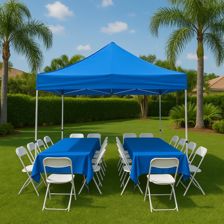 Make your celebration effortless with the Big Blue Party Package from Sunrise City Rentals. This all-in-one bundle includes a sturdy canopy tent, folding banquet tables, and comfortable white chairs — everything delivered directly to your location so you can focus on hosting. Designed to seat up to 16 guests, it’s ideal for birthdays, graduations, school events, family gatherings, and backyard celebrations.