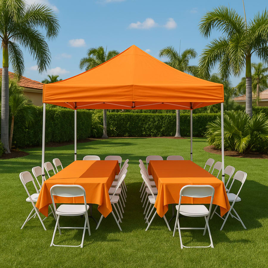 Bring energy and color to your event with the Orange Party Package from Sunrise City Rentals. This bundle includes a vibrant orange canopy tent, banquet tables, and white folding chairs, giving you a cheerful, shaded space to seat up to 16 guests. It’s a standout choice for birthdays, graduations, backyard barbecues, school events, and especially fall and Halloween celebrations.