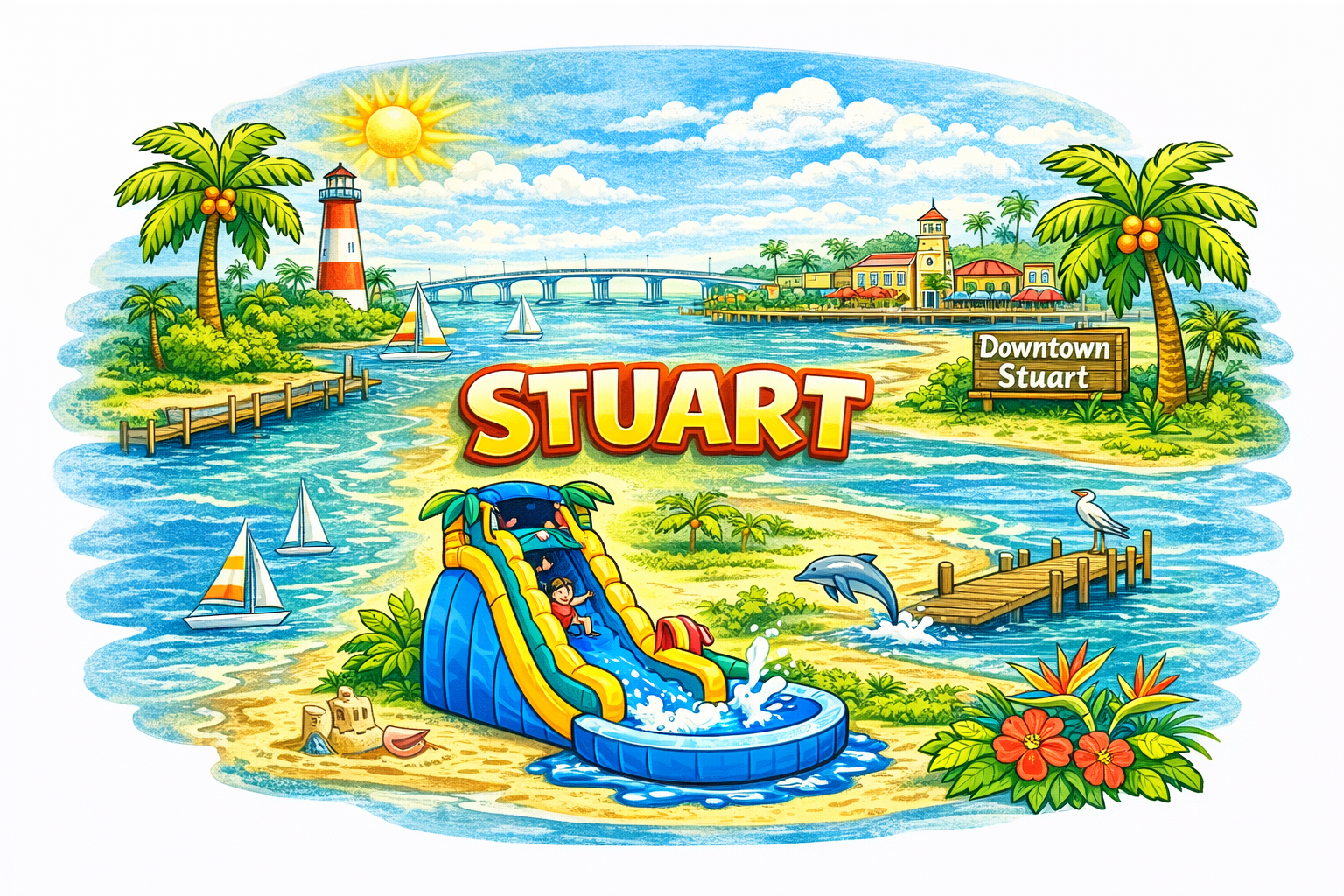 We proudly serve Stuart and surrounding Treasure Coast communities, including Port St. Lucie, Fort Pierce, Vero Beach, Jensen Beach, and Palm City. All rentals are commercial-grade, professionally cleaned, and delivered with care. Our larger slides book quickly, especially on weekends, so reserving early is recommended.
